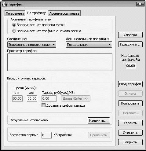 Для пользователей, считающих свои затраты, VDialer предлагает очень удобную систему статистики проведенного в Сети времени и потраченных денег. Просмотреть эти данные можно на вкладке Статистика. На вкладке Настройки, используя кнопку Настройки соединений, можно установить тарифы оплаты для разных соединений. Данная возможность особенно удобна, если пользоваться услугами нескольких провайдеров, которые взимают разную плату в зависимости от времени доступа, а иногда и дней недели, например, предоставляя скидки в выходные.