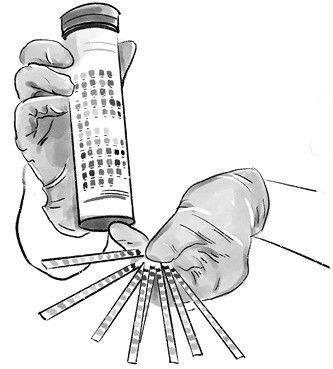 Тест-полоску необходимо опустить в баночку с мочой на несколько секунд, а затем промокнуть салфеткой и сравнить цвет полоски с предложенной шкалой.