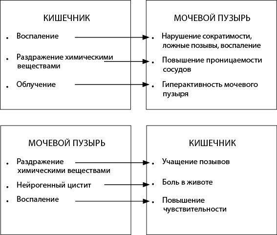Многочисленные эксперименты на животных, а также наблюдение за пациентами, имеющими одновременно проблемы с кишечником и мочевым пузырем, позволили выявить зависимость, которую назвали перекрестной сенсибилизацией – повышение чувствительности к стимулам одного органа при раздражении другого. Это приводит к появлению воспаления в мочевом пузыре при раздражении кишечника и наоборот.