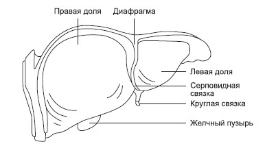 Обе печеночные доли разделены между собой спереди брюшинной (серповидной) складкой, сзади – венозной связкой, а снизу – круглой связкой, расположенной в борозде.
