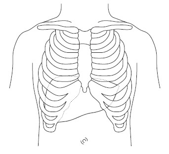 В норме верхняя граница правой доли проходит на уровне 5 ребра до точки, расположенной на 1 см ниже правого соска. Верхняя граница левой доли проходит по верхнему краю 6 ребра на 2 см ниже левого соска. В этом месте печень отделяется от верхушки сердца только диафрагмой.