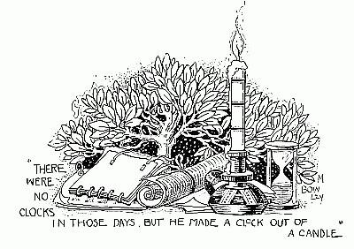 He used to divide up his time very carefully, giving part to study and part to settling disputes among his people, and part to his shipbuilding and his other duties. They had no clocks and watches in those days, and he used sometimes to get so interested in his work as to forget that it was time to leave it and go on to something else, just as you do sometimes when you get so interested in a game of rounders that you forget that it is time to go on with your lessons. The idea of a clock never entered into Alfred's head, at least not a clock with wheels, and hands on its face, but he was so clever that he made a clock out of a candle. He painted rings of different colours round the candle, and when the candle had burnt down to the first ring it was half an hour gone, and when it was burnt to the next ring it was another half-hour, and so on. So he could tell exactly how the time went.