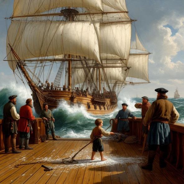 Могучий ветер, словно огромный великан, раскачивал корабль, заставляя его скрипеть всеми своими суставами. Белые гребешки волн, похожие на разъярённых псов, яростно облизывали борта судна. На палубе, среди суровых бородатых матросов, ютился крохотный мальчуган — Ванюшка, всего-то девяти лет от роду. Его худенькие ручонки едва обхватывали тяжёлый скребок, которым он отчаянно драил палубу, стараясь не отстать от взрослых.