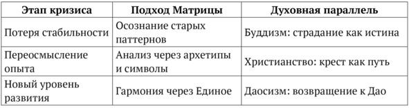 Великая Матрица предлагает рассматривать кризисы не как угрозу, а как точки бифуркации — моменты, когда система (человеческое сознание) может перейти на новый уровень развития. В терминах Матрицы, кризис — это столкновение противоположностей, где старые паттерны перестают работать, открывая возможность для пересмотра прошлого опыта и формирования нового. Например, потеря работы может стать не только стрессом, но и шансом переосмыслить свои цели, опираясь на архетип Мудреца или Героя, которые ведут к трансформации через испытания.