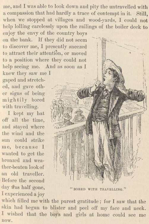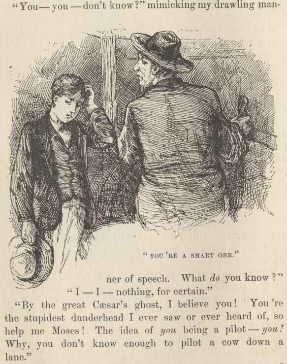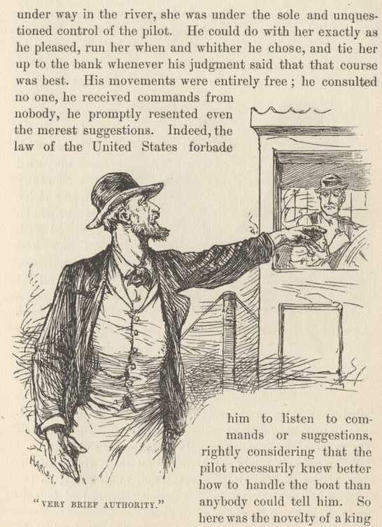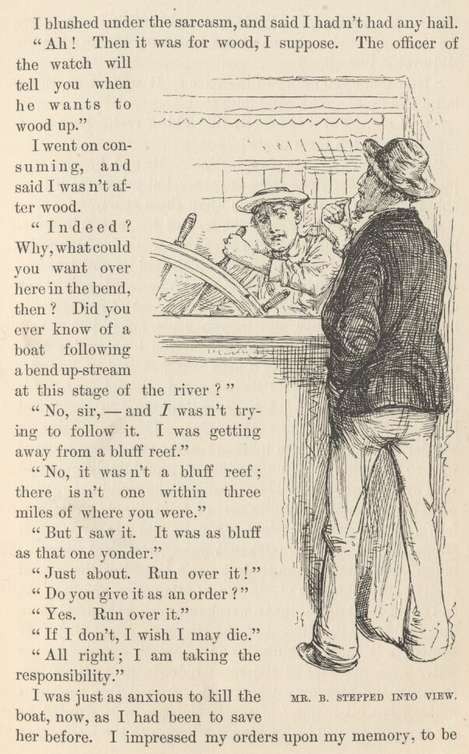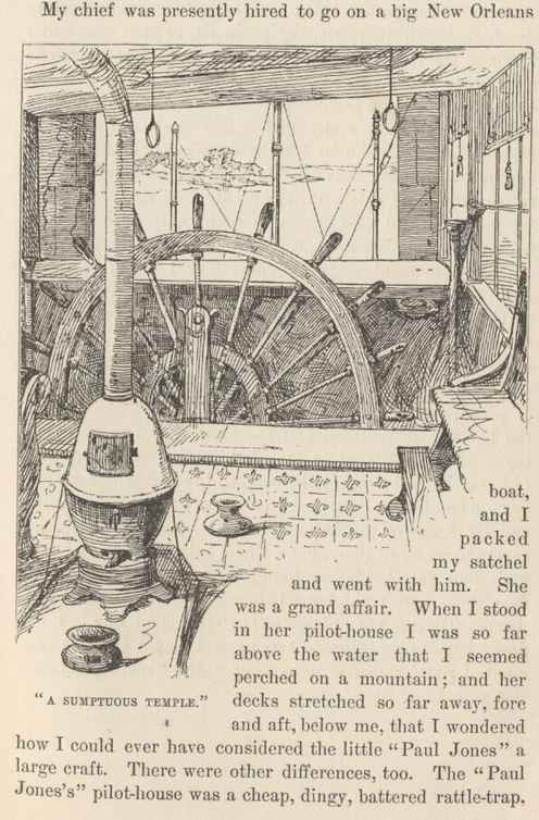 Thus ended the fictitious-name business. And not six hours out from St. Louis! but I had gained a privilege, any way, for I had been itching to get my hands on the wheel, from the beginning. I seemed to have forgotten the river, but I hadn't forgotten how to steer a steamboat, nor how to enjoy it, either.
