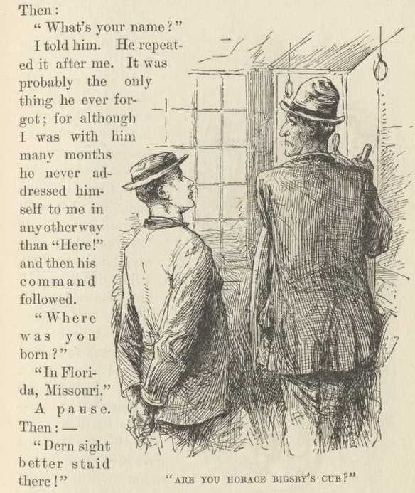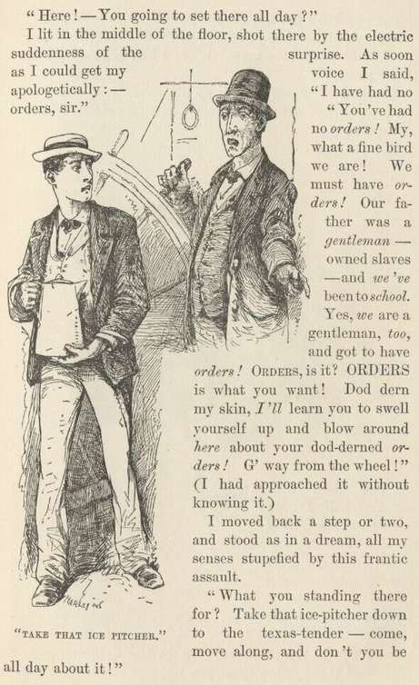 AFTER a close study of the face of the pilot on watch, I was satisfied that I had never seen him before; so I went up there. The pilot inspected me; I re-inspected the pilot. These customary preliminaries over, I sat down on the high bench, and he faced about and went on with his work. Every detail of the pilot-house was familiar to me, with one exception,—a large-mouthed tube under the breast-board. I puzzled over that thing a considerable time; then gave up and asked what it was for.