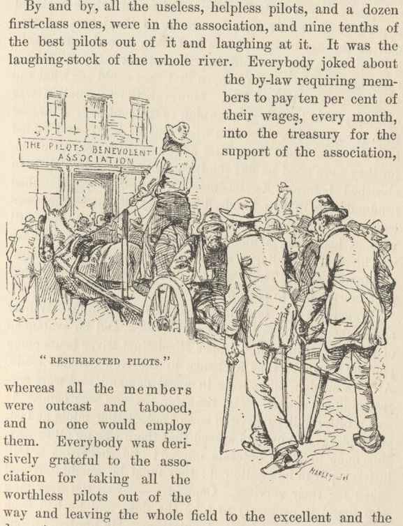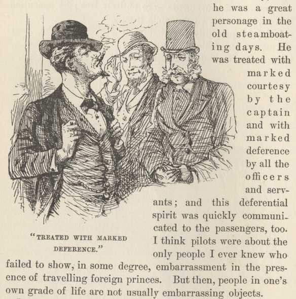 'Yes, it was one of the main difficulties about piloting. It was so hard to tell anything about the water; the damned things shift around so—never lie still five minutes at a time. You can tell a wind-reef, straight off, by the look of it; you can tell a break; you can tell a sand-reef—that's all easy; but an alligator reef doesn't show up, worth anything. Nine times in ten you can't tell where the water is; and when you do see where it is, like as not it ain't there when YOU get there, the devils have swapped around so, meantime. Of course there were some few pilots that could judge of alligator water nearly as well as they could of any other kind, but they had to have natural talent for it; it wasn't a thing a body could learn, you had to be born with it. Let me see: there was Ben Thornburg, and Beck Jolly, and Squire Bell, and Horace Bixby, and Major Downing, and John Stevenson, and Billy Gordon, and Jim Brady, and George Ealer, and Billy Youngblood—all A 1 alligator pilots. THEY could tell alligator water as far as another Christian could tell whiskey. Read it?—Ah, COULDN'T they, though! I only wish I had as many dollars as they could read alligator water a mile and a half off. Yes, and it paid them to do it, too. A good alligator pilot could always get fifteen hundred dollars a month. Nights, other people had to lay up for alligators, but those fellows never laid up for alligators; they never laid up for anything but fog. They could SMELL the best alligator water it was said; I don't know whether it was so or not, and I think a body's got his hands full enough if he sticks to just what he knows himself, without going around backing up other people's say-so's, though there's a plenty that ain't backward about doing it, as long as they can roust out something wonderful to tell. Which is not the style of Robert Styles, by as much as three fathom—maybe quarter-LESS.'