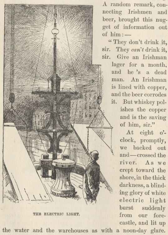 At eight o'clock, promptly, we backed out and crossed the river. As we crept toward the shore, in the thick darkness, a blinding glory of white electric light burst suddenly from our forecastle, and lit up the water and the warehouses as with a noon-day glare. Another big change, this—no more flickering, smoky, pitch-dripping, ineffectual torch-baskets, now: their day is past. Next, instead of calling out a score of hands to man the stage, a couple of men and a hatful of steam lowered it from the derrick where it was suspended, launched it, deposited it in just the right spot, and the whole thing was over and done with before a mate in the olden time could have got his profanity-mill adjusted to begin the preparatory services. Why this new and simple method of handling the stages was not thought of when the first steamboat was built, is a mystery which helps one to realize what a dull-witted slug the average human being is.