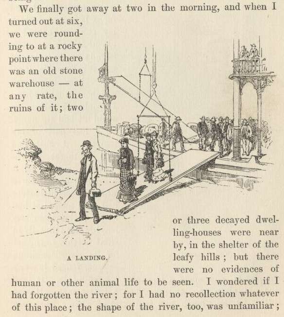 We finally got away at two in the morning, and when I turned out at six, we were rounding to at a rocky point where there was an old stone warehouse—at any rate, the ruins of it; two or three decayed dwelling-houses were near by, in the shelter of the leafy hills; but there were no evidences of human or other animal life to be seen. I wondered if I had forgotten the river; for I had no recollection whatever of this place; the shape of the river, too, was unfamiliar; there was nothing in sight, anywhere, that I could remember ever having seen before. I was surprised, disappointed, and annoyed.