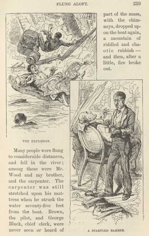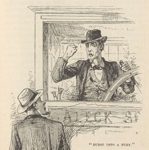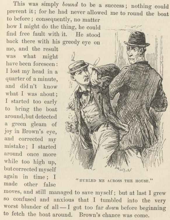 'That boat was the "Cyclone,"—last trip she ever made—she sunk, that very trip—captain was Tom Ballou, the most immortal liar that ever I struck. He couldn't ever seem to tell the truth, in any kind of weather. Why, he would make you fairly shudder. He WAS the most scandalous liar! I left him, finally; I couldn't stand it. The proverb says, "like master, like man;" and if you stay with that kind of a man, you'll come under suspicion by and by, just as sure as you live. He paid first-class wages; but said I, What's wages when your reputation's in danger? So I let the wages go, and froze to my reputation. And I've never regretted it. Reputation's worth everything, ain't it? That's the way I look at it. He had more selfish organs than any seven men in the world—all packed in the stern-sheets of his skull, of course, where they belonged. They weighed down the back of his head so that it made his nose tilt up in the air. People thought it was vanity, but it wasn't, it was malice. If you only saw his foot, you'd take him to be nineteen feet high, but he wasn't; it was because his foot was out of drawing. He was intended to be nineteen feet high, no doubt, if his foot was made first, but he didn't get there; he was only five feet ten. That's what he was, and that's what he is. You take the lies out of him, and he'll shrink to the size of your hat; you take the malice out of him, and he'll disappear. That "Cyclone" was a rattler to go, and the sweetest thing to steer that ever walked the waters. Set her amidships, in a big river, and just let her go; it was all you had to do. She would hold herself on a star all night, if you let her alone. You couldn't ever feel her rudder. It wasn't any more labor to steer her than it is to count the Republican vote in a South Carolina election. One morning, just at daybreak, the last trip she ever made, they took her rudder aboard to mend it; I didn't know anything about it; I backed her out from the wood-yard and went a-weaving down the river all serene. When I had gone about twenty-three miles, and made four horribly crooked crossings—'