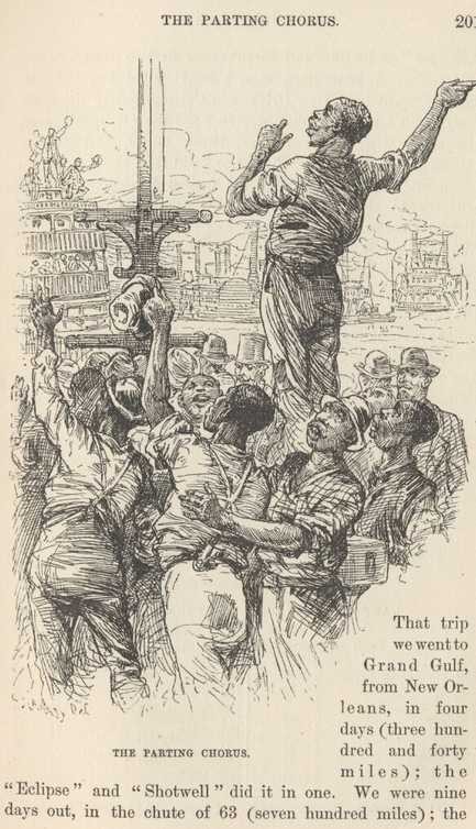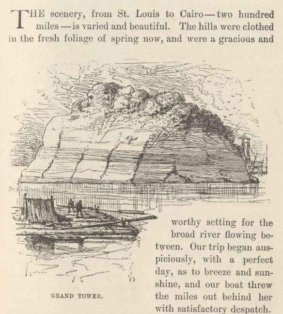 THE scenery, from St. Louis to Cairo—two hundred miles—is varied and beautiful. The hills were clothed in the fresh foliage of spring now, and were a gracious and worthy setting for the broad river flowing between. Our trip began auspiciously, with a perfect day, as to breeze and sunshine, and our boat threw the miles out behind her with satisfactory despatch.