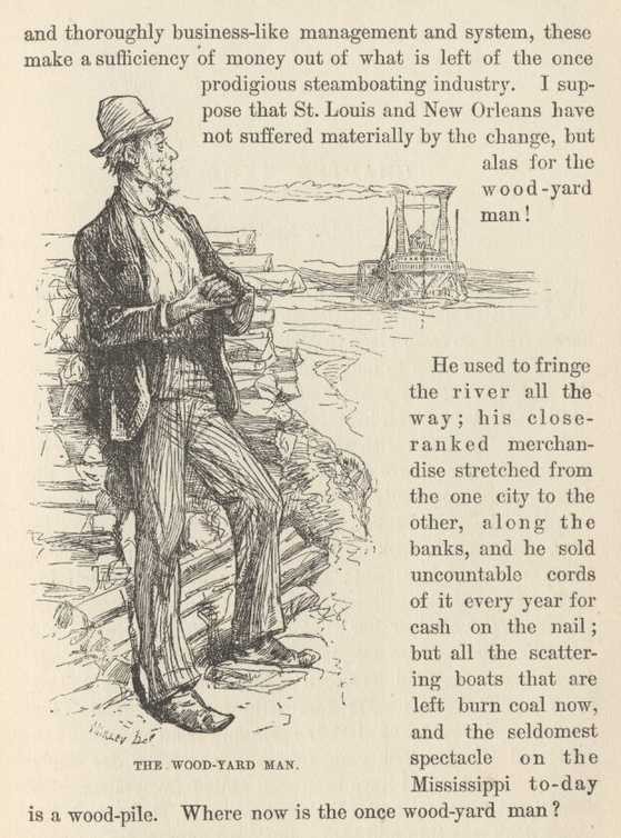 He used to fringe the river all the way; his close-ranked merchandise stretched from the one city to the other, along the banks, and he sold uncountable cords of it every year for cash on the nail; but all the scattering boats that are left burn coal now, and the seldomest spectacle on the Mississippi to-day is a wood-pile. Where now is the once wood-yard man?