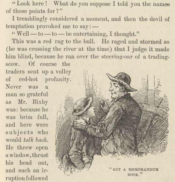 I had never felt so like a passenger before. I thanked him, with emotion, for each new fact, and wrote it down in my note-book. The pilot warmed to his opportunity, and proceeded to load me up in the good old-fashioned way. At times I was afraid he was going to rupture his invention; but it always stood the strain, and he pulled through all right. He drifted, by easy stages, into revealments of the river's marvelous eccentricities of one sort and another, and backed them up with some pretty gigantic illustrations. For instance—