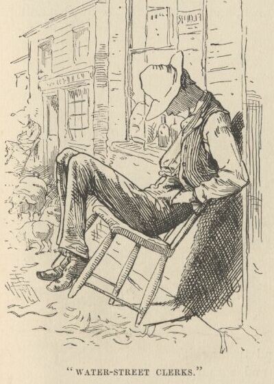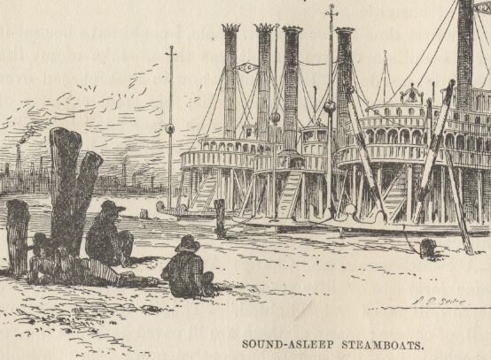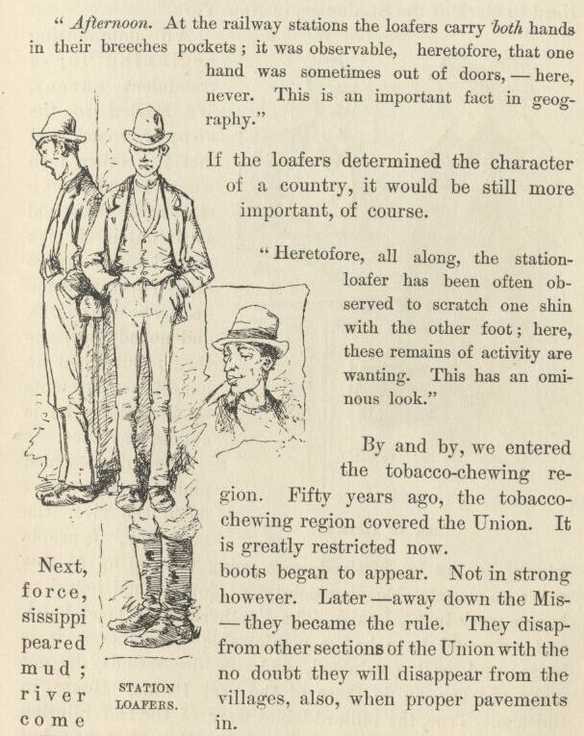 The pavements along the river front were bad: the sidewalks were rather out of repair; there was a rich abundance of mud. All this was familiar and satisfying; but the ancient armies of drays, and struggling throngs of men, and mountains of freight, were gone; and Sabbath reigned in their stead. The immemorial mile of cheap foul doggeries remained, but business was dull with them; the multitudes of poison-swilling Irishmen had departed, and in their places were a few scattering handfuls of ragged negroes, some drinking, some drunk, some nodding, others asleep. St. Louis is a great and prosperous and advancing city; but the river-edge of it seems dead past resurrection.