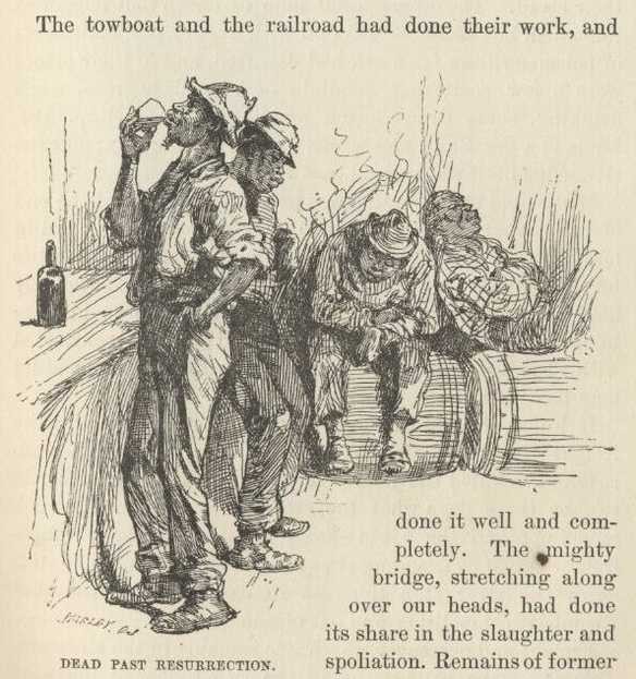 The towboat and the railroad had done their work, and done it well and completely. The mighty bridge, stretching along over our heads, had done its share in the slaughter and spoliation. Remains of former steamboatmen told me, with wan satisfaction, that the bridge doesn't pay. Still, it can be no sufficient compensation to a corpse, to know that the dynamite that laid him out was not of as good quality as it had been supposed to be.