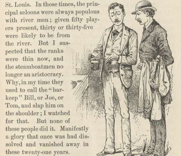 The most notable absence observable in the billiard-room, was the absence of the river man. If he was there he had taken in his sign, he was in disguise. I saw there none of the swell airs and graces, and ostentatious displays of money, and pompous squanderings of it, which used to distinguish the steamboat crowd from the dry-land crowd in the bygone days, in the thronged billiard-rooms of St. Louis. In those times, the principal saloons were always populous with river men; given fifty players present, thirty or thirty-five were likely to be from the river. But I suspected that the ranks were thin now, and the steamboatmen no longer an aristocracy. Why, in my time they used to call the 'barkeep' Bill, or Joe, or Tom, and slap him on the shoulder; I watched for that. But none of these people did it. Manifestly a glory that once was had dissolved and vanished away in these twenty-one years.