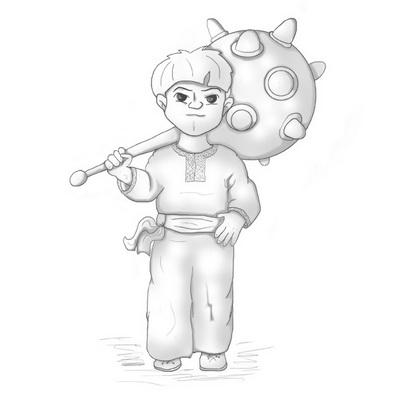 Не забув художник і про Котигорошко — одного з найвідоміших персонажів українських народних казок. Силача Мілош намалював з величезною булавою в руках.