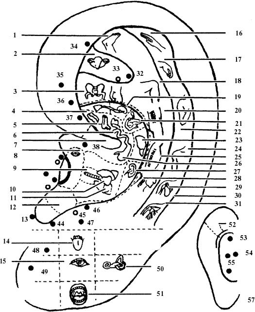 1 – пальцы стопы; голеностопная область; 2– матка; 3 – седалищный нерв; 4 – толстая кишка; 5 – аппендикс; 6 – тонкая кишка; 7 – диафрагма; 8 – рот; 9 – трахея; 10 – сердце; 11 – легкие; 12 – три части туловища; 13 – зрение I;14 – язык; 15 – глаза; 16– пальцы кисти; 17 – запястье; 18 – колено; 19 – почка; 20 – живот; 21 – поджелудочная железа; 22 – локоть; 23 – печень; 24 – плечо; 25 – область груди; 26 – желудок; 27 – селезенка; 28 – шейный отдел позвоночника; 29 – плечевой сустав; 30 – лопатка; 31 – шея; 32 – точка тхан-мон; 33 – ягодица; 34 – геморрой; 35 – наружные половые органы; 36 – мочеточник; 37 – нижняя часть прямой кишки; 38 – пищевод; 39 – вершина козелка; 40 – горло, 41 – нос; 42 – надпочечник; 43 – носовая полость; 44 – зрение II. 45 – яичко; 46 – регулирующая дыхание; 47 – лоб; 48, 49 – точки анальгезии; 48 – обезболивание приудалении верхних зубов; 49 – обезболиваниетри удалении нижних зубов; 50 – внутреннее ухо; 51 – миндалины; 52 – гипотензивная канавка; 53 – головная боль; 54 – почки; 55 – сердце; 56 – нижняя конечность; 57 – задняя поверхность ушной раковины.