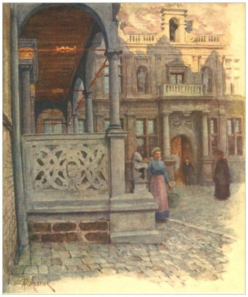 In the Grande Place, as in the Grande Place of Brussels, were other guild houses, distinguished by their quaint gables and towering façades, each the home of some great corporation. There, too, was the Hôtel de Ville, built of marble, and called 'the wonder of the world,' lately erected to take the place of an earlier structure which was no longer considered worthy of the Antwerp which, having dethroned her rival Bruges, was now called by her proud inhabitants the 'Queen of the North.' In all parts of this opulent city bankers and merchants—Fuggers, Greshams, Stettens, Spinolas, and many more—had built for themselves luxurious houses, and met daily at the Bourse, where more business was done than anywhere else in Europe.