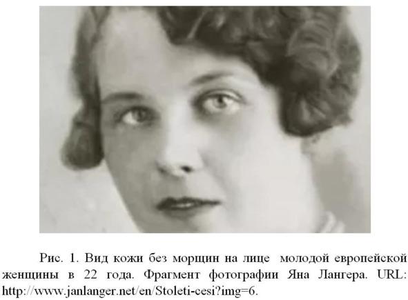 Из-за уменьшения числа потовых и сальных желез кожа становится более сухой, уменьшается ее эластичность. У мужчин понижение салоотделения происходит позже, чем у женщин. Наиболее наглядными признаками старения являются морщины. С возрастом появляются множественные морщины на коже, особенно на открытых участках, таких как лицо, например, так называемые «гусиные лапки» у наружного угла глаза (Хрисанфова, 1999). На рис.1 приведена фотография молодой европейской женщины в возрасте 22 года, а на рис. 2, для сравнения, фотография той же, но уже состарившейся женщины в 102 года. Лицо стареет быстрее, чем другие части тела. Объясняется это тем, что лицо больше подвержено атмосферным воздействиям, в том числе солнечному свету, по сравнению с другими частями тела. Старение под воздействием солнечного света принято называть фотостарением, так как солнечный свет ускоряет старение кожи.