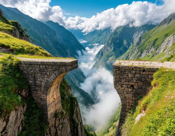 Через несколько секунд мост готов. Он очень тонкий в середине пролета, всего в один камень. Мальчик и котенок осторожно идут по мосту, но мост крепкий, добротный. Внизу моста — глубокая пропасть, дна которого не видно из–за тумана, который находится далеко внизу.