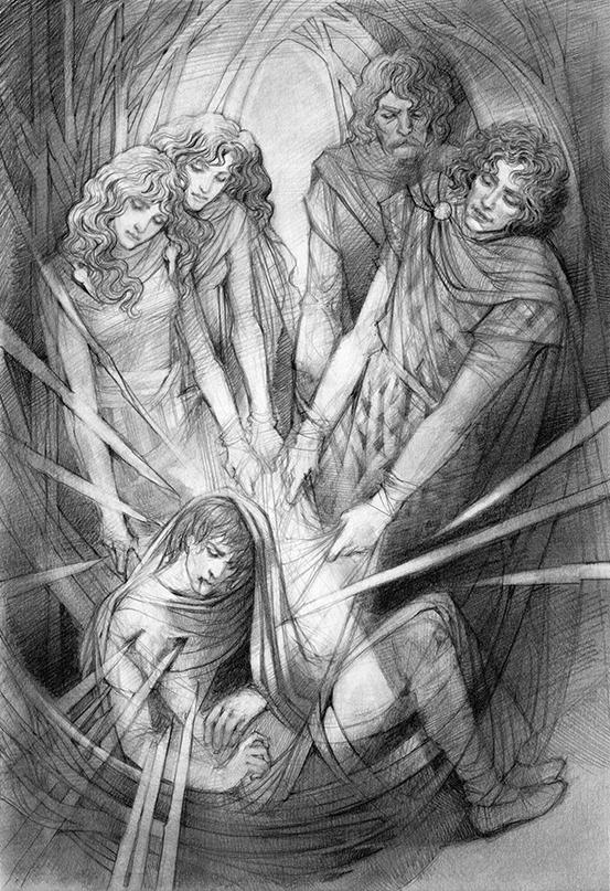 Старшая из девушек опустилась на колени перед кустом боярышника, усыпанного белыми звездочками. Услышав вопрос, она обернулась и ненароком уколола палец о шип. Подошел Кинрик и поцеловал ранку. Диэда закраснелась и быстро спросила:
