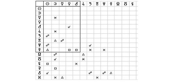 Далее выписываем все аспекты между десятью основными планетами: это Солнце, Луна, Меркурий, Венера, Марс, Юпитер, Сатурн, Уран, Нептун, Плутон.
