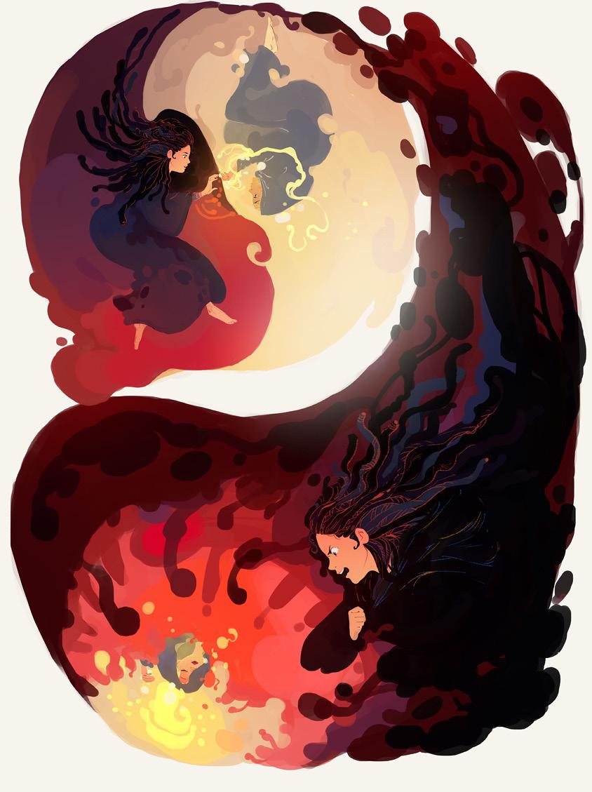 Вдруг сфера качнулась, будто кто-то крутанул шарик. Мир перевернулся, Эльда теперь находилась внизу, на самом дне, а всё пространство над ней заполняли красные всполохи. Только тонкая перегородка защищала её от гибели. Если она не выдержит, золотистые искры полностью растворятся в красном потоке.