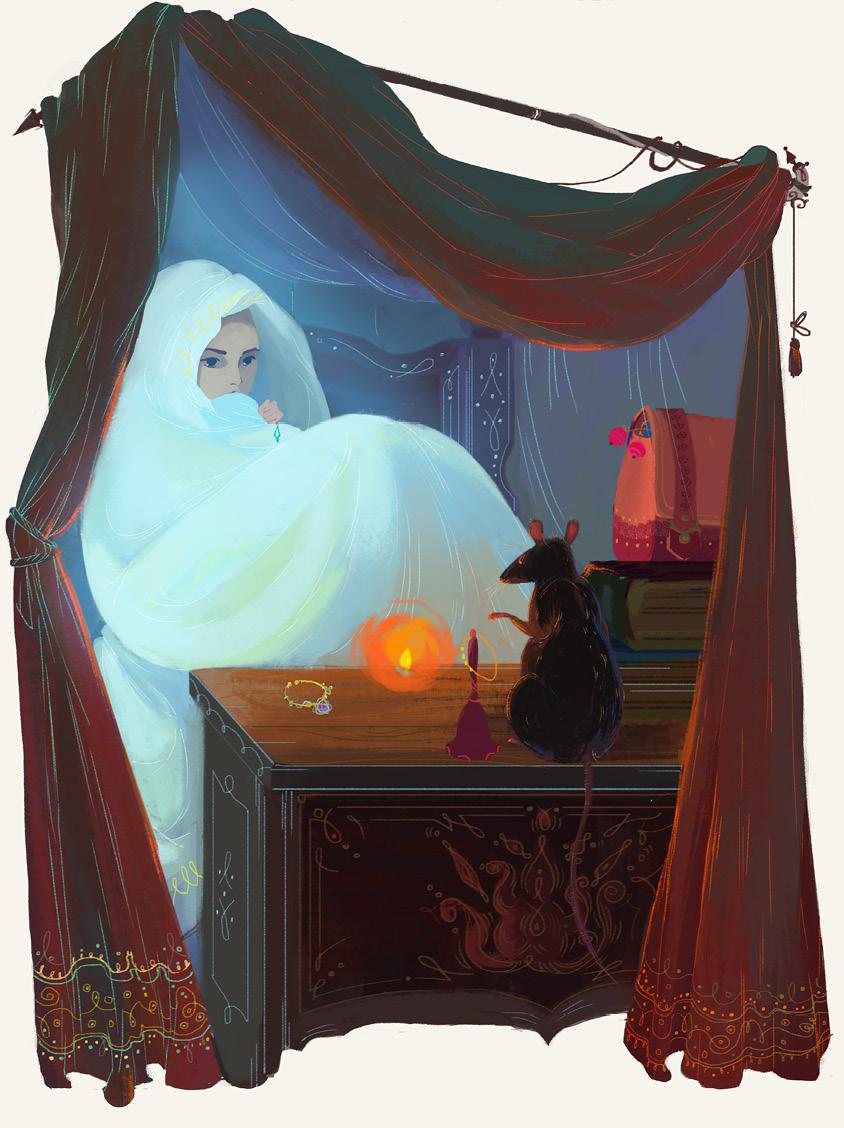 Она лежала на незнакомой кровати, которая с двух сторон была укрыта от случайных глаз плотными серебристыми ширмами, будто маленькое уютное убежище, а с третьей стороны кто-то сдвинул ширму в сторону. Эльда увидела небольшой столик, стул и шкаф для одежды, два окна, плотно закрытые тяжёлыми портьерами. В комнате царил полумрак, но сейчас это было как нельзя кстати: ей не хотелось яркого света. Выглянув из-за ширмы, девочка увидела ещё одну кровать напротив, у второго окна, а третью — слева от двери. Справа от входа Эльда разглядела уютный рабочий уголок: стол с креслами, диванчик, книжный шкаф.
