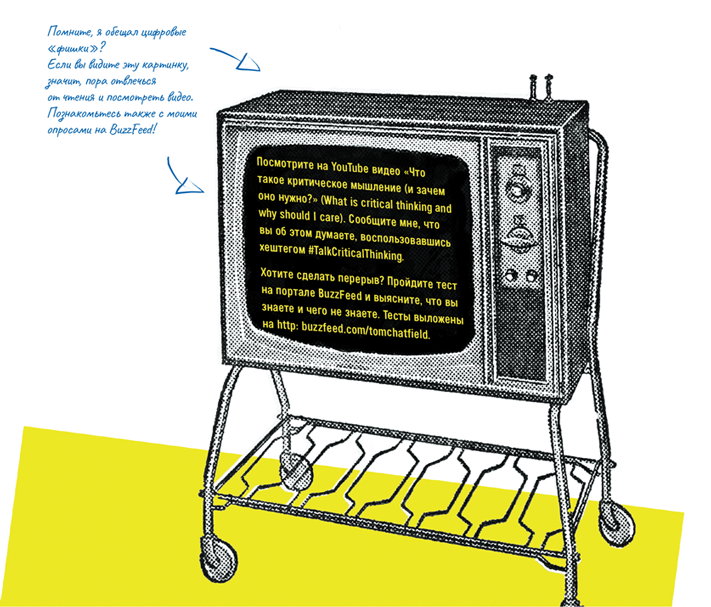 Настоятельно прошу вас делиться со мной напрямую соображениями по поводу этой книги через социальные сети — пишите на @TomChatfield — и обсуждать ее со мной и с другими читателями, пользуясь хештегом #TalkCriticalThinking. Кроме того, в каждой главе вы найдете ссылки на онлайн-источники, например видео, — их легко отыскать на YouTube и в Vimeo по хештегу #TalkCriticalThinking.