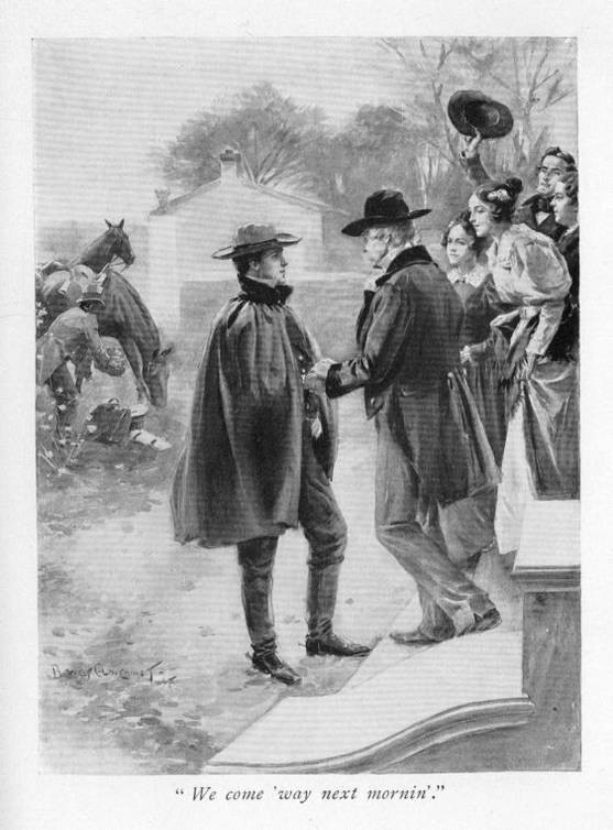 "We come 'way next mornin'. When marster heah 'bout it he didn' teck to de notion at all, 'cause her pa—dat is, he warn' her own pa, 'cause he had married her ma when she wuz a widder after Miss Charlotte pa died—an' he politics warn' same as ourn. 'Why, you kin never stand him, suh,' he said to Marse George. 'We won't mix any mo'n fire and water; you ought to have found that out at college; dat fellow Darker is his son.'"