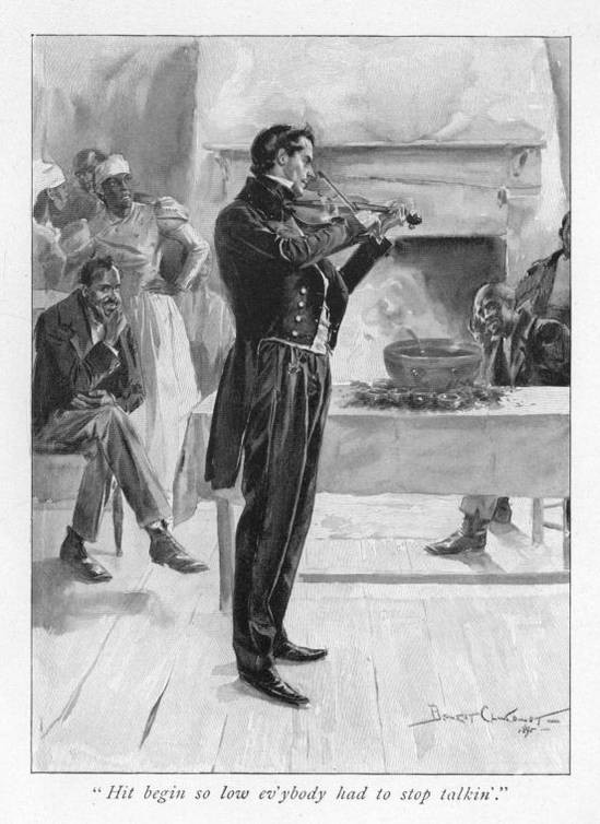 "Den presney dee wuz talkin' 'bout stoppin'. De ole Cun'l say hit time to have prars, an' dee wuz beggin' him to wait a leetle while; an' Jack Forester lay he fiddle down nigh Marse George, an' he picked 't up an' drawed de bow 'cross it jes to try it, an' den jes projickin' he struck dat chune 'bout 'You'll ermember me.' He hadn' mo'n tech de string when you couldn' heah a pin drap. Marse George he warn noticin', an' he jes lay he face on de fiddle, wid he eyes sort o' half shet, an' drawed her out like he'd do some nights at home in dee moonlight on de gret porch, tell on a sudden he looked up an' cotch Miss Charlotte eye leanin' for'ards so earnest, an' all on 'em list'nin', an' he stopt, an' dee all clapt dee hands, an' he sudney drapt into a jig. Jack Forester ain' had to play no mo' dat night. Even de ole Cun'l ketched de fever, an' he stept out in de flo' in he long-tail coat an' high collar, an' knocked 'em off de 'Snowbud on de Ash-bank,' an' 'Chicken in de Bread-tray,' right natchel.