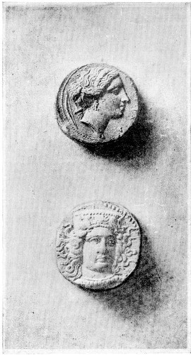 [1] Photography cannot exhibit the character of large and finished sculpture; but its audacity of shadow is in perfect harmony with the more roughly picturesque treatment necessary in coins. For the rendering of all such frank relief, and for the better explanation of forms disturbed by the luster of metal or polished stone, the method employed in the plates of this volume will be found, I believe, satisfactory. Casts are first taken from the coins, in white plaster; these are photographed, and the photograph printed by the autotype process. Plate XII. is exceptional, being a pure mezzotint engraving of the old school, excellently carried through by my assistant, Mr. Allen, who was taught, as a personal favor to myself, by my friend, and Turner's fellow-worker, Thomas Lupton. Plate IV. was intended to be a photograph from the superb vase in the British Museum, No. 564 in Mr. Newton's Catalogue; but its variety of color defied photography, and after the sheets had gone to press I was compelled to reduce Le Normand's plate of it, which is unsatisfactory, but answers my immediate purpose.