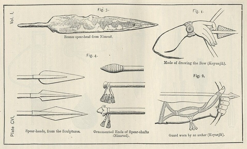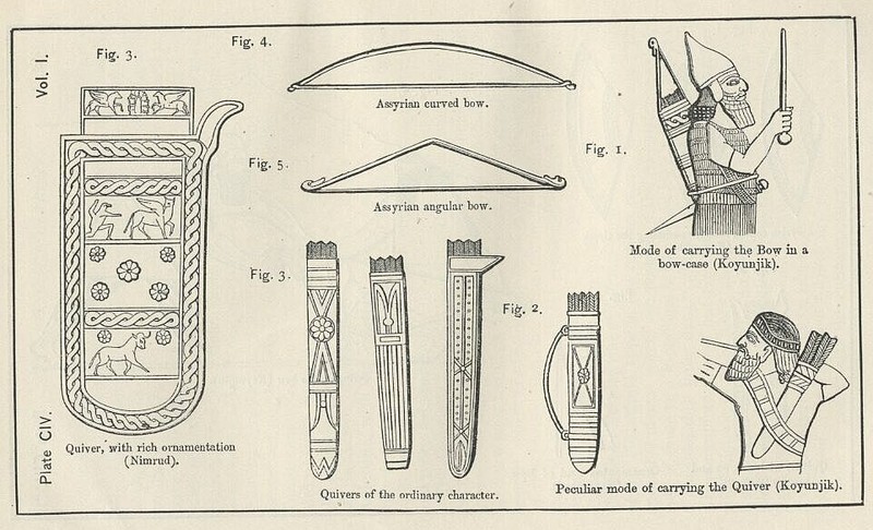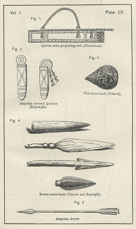 There is nothing remarkable in the Assyrian arrows except their perfect finish and completeness in all that constitutes the excellence of such a weapon. The shaft was thin and straight, and was probably of reed, or of some light and tough wood. The head was of metal, either of bronze or iron, and was generally diamond-shaped, like a miniature spear-head. [PLATE CV., Fig. 4. ] It was flattish, and for greater strength had commonly a strongly raised line down the centre. The lower end was hollowed, and the shaft was inserted into it. The notching and feathering of the shaft were carefully attended to. It is doubtful whether three feathers were used, as by ourselves and by the Egyptians, or two only as by many nations. The fact that we never see more than two feathers upon the monuments cannot be considered decisive, since the Assyrian artists, from their small knowledge of perspective, would have been unable to represent all three feathers. So far as we can judge from the representations, it would seem that the feathers were glued to the wood exactly as they are with ourselves. The notch was somewhat large, projecting beyond the line of the shaft—a construction rendered necessary by the thickness of the bowstring., which was seldom less than of the arrow it-self. [PLATE CV., Fig. 5.]