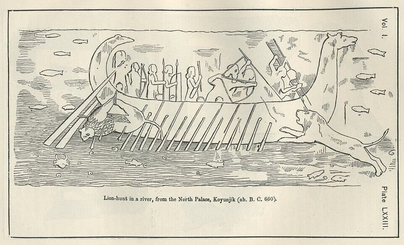 The foes of the Assyrians would sometimes, when hard pressed, desert the dry land, and betake themselves to the marshes, or cross the sea to islands where they trusted that they might be secure from attack. Not unfrequently they obtained their object by such a retreat, for the Assyrians were not a maritime people. Sometimes, however, they were pursued. The Assyrians would penetrate into the marshes by means of reed boats, probably not very different from the terradas at present in use among the Arabs of the Mesopotamian marsh districts. Such boats are represented upon the bas-reliefs as capable of holding from three to five armed men. On these the Assyrian foot-soldiers would embark, taking with them a single boatman to each boat, who propelled the vessel much as a Venetian gondolier propels his gondola, i.e., with a single long oar or paddle, which he pushed from him standing at the stern. They would then in these boats attack the vessels of the enemy, which are always represented as smaller than theirs, run them down or board them, kill their crews or force them into the water, or perhaps allow them to surrender. Meanwhile, the Assyrian cavalry was stationed round the marsh among the tall reeds which thickly clothed its edge, ready to seize or slay such of the fugitives as might escape from the foot.