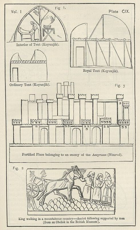 It does not appear whether the army generally was provided with tents or not. Possibly the bulk of the soldiers may have bivouacked in the open field, unless when they were able to obtain shelter in towns or villages taken from the enemy. Tents, however, were certainly provided for the monarch and his suite. [PLATE CIX., Fig. 1.] Like the tents of the Romans, these appear to have been commonly pitched within a fortified enclosure, which was of an oval shape. They were disposed in rows, and were all nearly similar in construction and form, the royal tent being perhaps distinguished from the others by a certain amount of ornamentation and by a slight superiority of size. The material used for the covering was probably felt. All the tents were made open to the sky in the centre, but closed in at either extremity with a curious semicircular top. [PLATE CIX., Fig. 1.] The two tops were unequal of size. Internally, either both of them, or at any rate the larger ones, were supported by a central pole, which threw out branches in different directions resembling the branches of a tree or the spokes of a parasol. Sometimes the walls of the tent had likewise the support of poles, which were kept in place by ropes passed obliquely from the top of each to the ground in front of them, and then firmly secured by pegs. Each tent had a door, square-headed, which was placed at the side, near the end which had the smaller covering. The furniture of tents consisted of tables, couches, footstools, and domestic utensils of various kinds. [PLATE CIX., Fig. 1.] Within the fortified enclosure, but outside the tents, were the chariot and horses of the monarch, an altar where sacrifice could be made, and a number of animals suitable for food, as oxen, sheep, and goats.