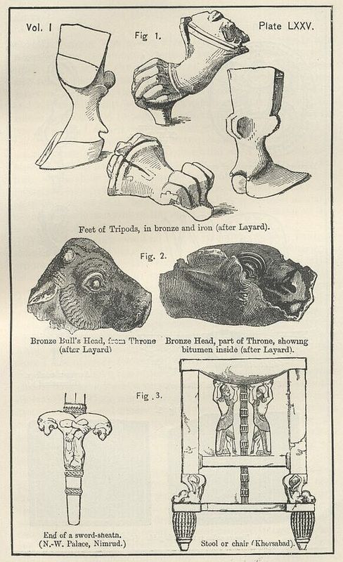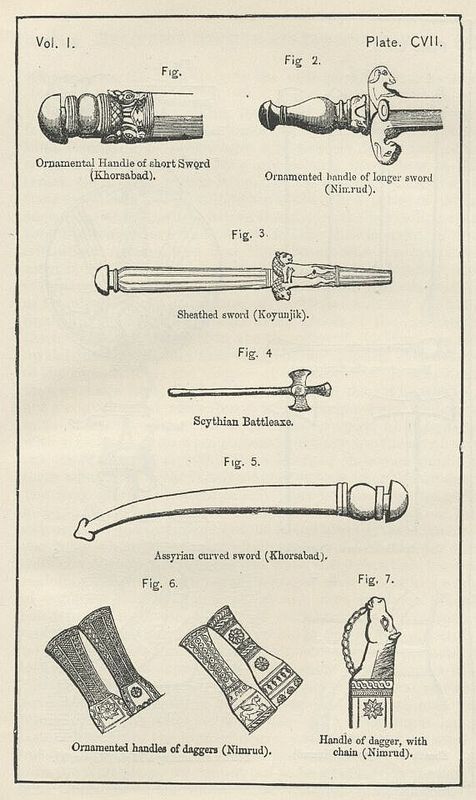 The dagger was worn by the Assyrian kings at almost all times in their girdles, and was further often assigned to the mythic winged beings, hawk headed or human-headed, which occur so frequently in the sculptures; but it seems to have been very seldom carried by subjects. It had commonly a straight handle, slightly concave, and very richly chased, exhibiting the usual Assyrian patterns, rosettes, chevrons, guilloches, pine-cones, and the like. [PLATE CVII., Fig. 6.] Sometimes, however, it was still more artistically shaped, being cast into the form of a horse's head and neck. In this case there was occasionally a chain attached at one end to the horse's chin, and at the other to the bottom of his neck, which, passing outside the hand, would give it a firmer hold on the weapon. The sheaths of daggers seem generally to have been plain, or nearly so, but occasionally they terminated in the head of an animal, from whose mouth depended a tassel. [PLATE CVIII., Fig. 2.]