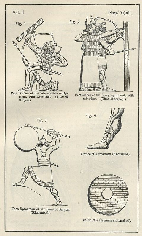 In the early part of the second period, which synchronizes with the reign of Sargon, the difference in the costumes of the foot-soldiers becomes much more marked. The Assyrian infantry now consists of two great classes, archers and spear-men. The archers are either light-armed or heavy-armed, and of the latter there are two clearly distinct varieties. The light-armed have no helmet, but wear on their heads a mere fillet or band, which is either plain or patterned. [PLATE XCVI., Fig. 3.] Except for a cross-belt which supports the quiver, they are wholly naked to the middle. Their only garment is a tunic of the scantiest dimensions, beginning at the waist, round which it is fastened by a broad belt or girdle, and descending little more than half-way down the thigh. In its make it sometimes closely resembles the tunic of the first period, but more often it has the peculiar pendent ornament which has been compared to the scotch phillibeg, and which will be here given that name. It is often patterned with squares and gradines. The light-armed archer has usually bare feet; occasionally, however, he wears the slight sandal of this period, which is little more than a cap for the heel held in place by two or three strings passed across the instep. There is nothing remarkable in his arms, which resemble those of the preceding period: but it may be observed that, while shooting, he frequently holds two arrows in his right hand besides that which is upon the string. He shoots either kneeling or standing, generally the latter. His ordinary position is in the van of battle, though sometimes a portion of the heavy-armed troops precede him. He has no shield, and is not protected by an attendant, thus running more risk than any of the rest of the army.