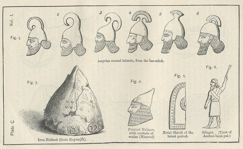 As if to compensate themselves for the uniformity to which they submitted in this instance, the Assyrians indulged in a variety of crested helmets. [PLATE. C., Fig. 5.] We cannot positively say that they invented the crest; but they certainly dealt with it in the free spirit which is usually seen where a custom is of home growth and not a foreign importation. They used either a plain metal crest, or one surmounted by tuffs of hair; and they either simply curved the crest forwards over the front of the helmet, or extended it and carried it back-wards also. In this latter case they generally made the curve a complete semicircle, while occasionally they were content with a small segment, less even than a quarter of a circle. They also varied considerably the shape of the lappet over the ear, and the depth of the helmet behind and before the lappet.