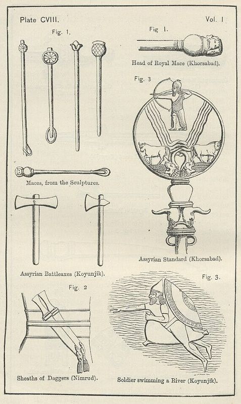 The Assyrian mace was a short thin weapon, and must either have been made of a very tough wood, or—and this is more probable of metal. [PLATE CVIII., Fig. 7.] It had an ornamented head, which was sometimes very beautifully modelled and generally a strap or string at the lower end, by which it could be grasped with greater firmness. Foot archers frequently carried it in battle, especially those who were in close attendance upon the king's person. It seems, however, not to have been often used as a warlike weapon until the time of the latest sculptures, when we see it wielded, generally with both hands, by a certain number of the combatants. In peace it was very commonly borne by the royal attendants, and it seems also to have been among the weapons used by the monarch himself, for whom it is constantly carried by one of those who wait most closely upon his person. [PLATE., CVIII., Fig. I.]
