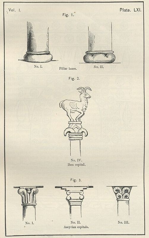 In the early sculptures the tiara is more depressed than in the later, and it is also less richly ornamented. It has seldom more than two bands, viz., a narrow one at top, and at bottom a broader curved one, rising towards the front. To this last are attached two long strings or lappets, which fall behind the monarch's back to a level with his elbow. [PLATE CXIII., Fig. 1.]