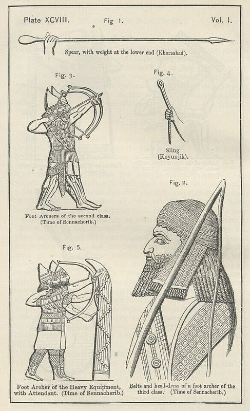 Some important changes seen to have been made under Sennacherib in the equipment and organization of the infantry force. These consisted chiefly in the establishment of a greater number of distinct corps differently armed, and in an improved equipment of the more important of them. Sennacherib appears to have been the first to institute a corps of slingers, who at any rate make their earliest appearance in his sculptures. They were kind of soldier well-known to the Egyptians and Sennacherib's acquaintance with the Egyptian warfare may have led to their introduction among the troops of Assyria. The slinger in most countries where his services were employed was lightly clad, and reckoned almost as a supernumerary. It is remarkable that in Assyria he is, at first, completely armed according to Assyrian ideas of completeness, having a helmet, a coat of mail to the waist, a tunic to the knees, a close-fitting trouser, and a short boot or greave. The weapon which distinguishes him appears to have consisted of two pieces of rope or string, attached to a short leathern strap which received the stone. [PLATE XCVIII., Fig. 4.] Previous to making his throw, the slinger seems to have whirled the weapon round his head two or three times, in order to obtain on increased impetus—a practice which was also known to the Egyptians and the Romans. With regard to ammunition, it does not clearly appear how the Assyrian slinger was supplied. He has no bag like the Hebrew slinger, no sinus like the Roman. Frequently we see him simply provided with a single extra stone, which he carries in his left hand. Sometimes, besides this reserve, he has a small heap of stones at his feet; but whether he has collected them from the field, or has brought them with him and deposited them where they lie, is not apparent.