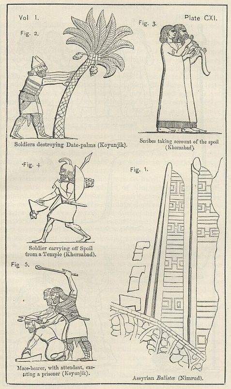 When at last the city or castle was by some of these means reduced, and the garrison consented to surrender itself, the work of demolition, already begun, was completed. Generally the place was set on fire; sometimes workmen provided with pickaxes and other tools mounted upon the ramparts and towers, hurled down the battlements, broke breaches in the walls, or even levelled the whole building. [PLATE CXII., Fig. 1.] Vengeance was further taken by the destruction of the valuable trees in the vicinity, more especially the highly prized date-palms, which were cut with hatchets half through their stems at the distance of about two feet from the ground, and then pulled or pushed down. [PLATE CXI., Fig. 2.] Other trees were either treated similarly, or denuded of their branches. Occasionally the destruction was of a less wanton and vengeful character. Timber-trees were cut down for transport to Assyria, where they were used in the construction of the royal-palaces; and fruit-trees were occasionally taken up by the roots, removed carefully, and planted in the gardens and orchards of the conquerors. Meanwhile there was a general plundering of the captured place. The temples were entered, and the images of the gods, together, with the sacred vessels, which were often of gold and silver, were seized and carried off in triumph. [PLATE CXI., Fig. 4.] This was not mere cupidity. It was regarded as of the utmost importance to show that the gods of the Assyrians were superior to those of other countries, who were powerless to protect either their votaries or even themselves from the irresistible might of the servants of Asshur. The ordinary practice was to convey the images of the foreign gods from the temples of the captured places to Assyria, and there to offer then at the shrines of the principal Assyrian deities. Hence the special force of the proud question, "Where are the gods of Hanath and of Arpad? Where are the gods of Sepharvaim, Hena, and Ivah? Where are they but carried captive to Assyria, prisoners and slaves in the temples of those deities whose power they ventured to resist?"