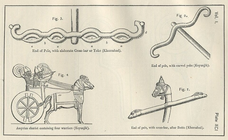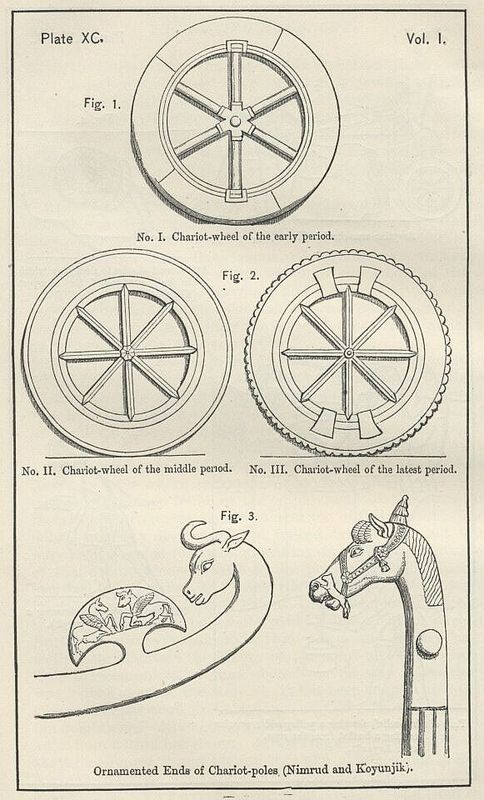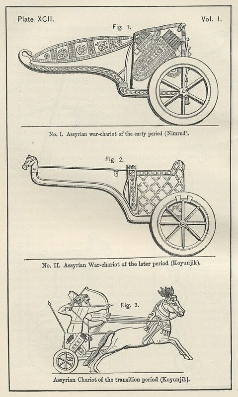 The position occupied by chariots in the military system of Assyria is indicated in several passages of Scripture, and distinctly noticed by many of the classical writers. When Isaiah began to warn his countrymen of the 'miseries in store for them at the hands of the new enemy which first attacked Judea in his day, he described them as a people "whose arrows were sharp, and all their bows bent, whose horses' hoofs should be counted like flint, and their wheels like a whirlwind." When in after days he was commissioned to raise their drooping courage by assuring them that they would escape Sennacherib, who had angered God by his pride, he noticed, as one special provocation of Jehovah, that monarch's confidence in the multitude of his chariots. Nahum again, having to denounce the approaching downfall of the haughty nation, declares that God is "against her, and will burn her chariots in the smoke." In the fabulous account which Ctesias gave of the origin of Assyrian greatness, the war-chariots of Ninus were represented as amounting to nearly eleven thousand, while those of his wife and successor, Semiramis, were estimated at the extravagant number of a hundred thousand. Ctesias further stated that the Assyrian chariots, even at this early period, were armed with scythes, a statement contradicted by Xenophon, who ascribes this invention to the Persians, and one which receives no confirmation from the monuments. Amid all this exaggeration and inventiveness, one may still trace a knowledge of the fact that war-chariots were highly esteemed by the Assyrians from a very ancient date, while from other notices we may gather that they continued to be reckoned an important arm of the military service to the very end of the empire.