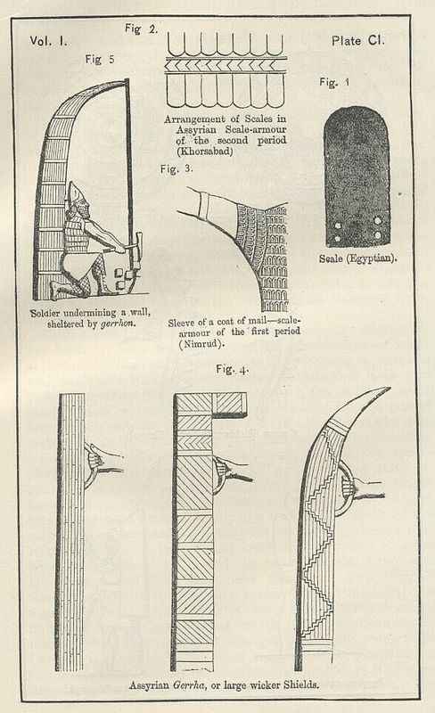 A remarkable variety existed in the form and construction of the Assyrian shields. The most imposing kind is that which has been termed the gerrhon, from its apparent resemblance to the Persian shield mentioned under that name by Herodotus. [PLATE CI.. Fig. 1.] This was a structure in wickerwork, which equalled or exceeded the warrior in height, and which was broad enough to give shelter to two or even three men. In shape it was either an oblong square, or such a square with a projection at top, which stood out at right angles to the body of the shield; or, lastly, and most usually, it curved inwards from a certain height, gradually narrowing at the same time, and finally ending in a point. Of course a shield of this vast size, even although formed of a light material, was too heavy to be very readily carried upon the arm. The plan adopted was to rest it upon the ground, on which it was generally held steady by a warrior armed with sword or spear, while his comrade, whose weapon was the bow, discharged his arrows from behind its shelter. Its proper place was in sieges, where the roof-like structure at the top was especially useful in warding off the stones and other missiles which the besieged threw down upon their assailants. We sometimes see it employed by single soldiers, who lean the point against the wall of the place, and, ensconcing themselves beneath the penthouse thus improvised, proceed to carry on the most critical operations of the siege in almost complete security.
