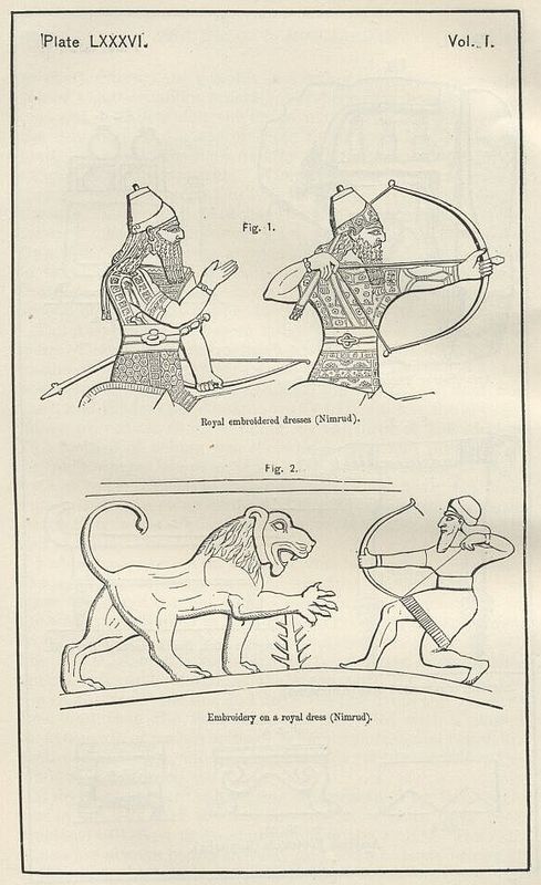 Assyrian coats of mail were of three sizes, and of two different constructions. In the earlier times they were worn long, descending either to the feet or to the knees; and at this period they seem to have been composed simply of successive rows of similar iron scales sewn on to a shirt of linen or felt. [PLATE CI., Fig. 1.] Under the later monarchs the coat of mail reached no lower than the waist, and it was composed of alternate bands of dissimilar arrangement and perhaps of different material. Mr. Layard suggests that at this time the scales, which were larger than before, were "fastened to bands of iron or copper." But it is perhaps more probable that scales of the old character alternated in rows with scales of a new shape and smaller dimensions. [PLATE CI., Fig. 2.] The old scales were oblong, squared at one end and rounded at the other, very much resembling the Egyptian. They were from two to three inches, or more, in length, and were placed side by side, so that their greater length corresponded with the height of the wearer. The new scales seem to have been not more than an inch long; they appear to have been pointed at one end, and to have been laid horizontally, each a little overlapping its fellow. It was probably found that this construction, while possessing quite as much strength as the other, was more favorable to facility of movement.