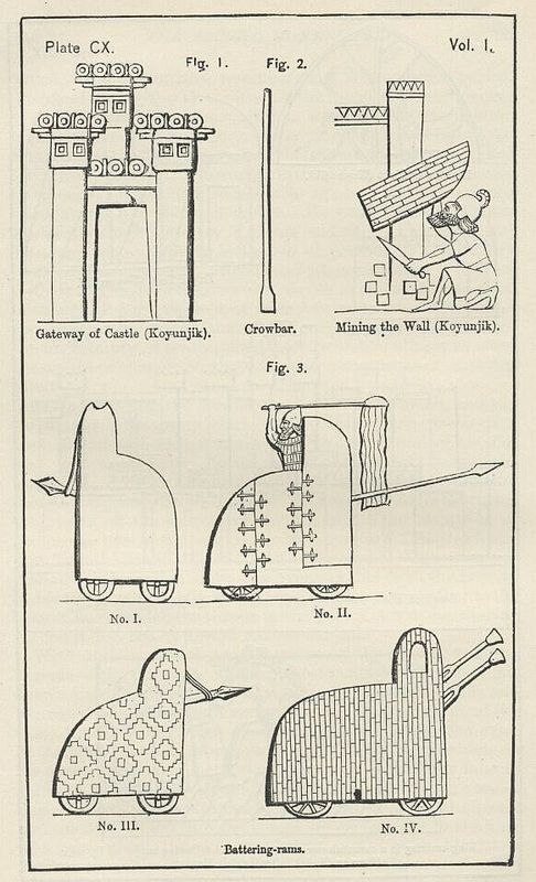 If the escalade failed, or if it was thought unadvisable to attempt it, the plan most commonly adopted was to try the effect of the battering-ram. [PLATE CX., Fig. 3.] The Assyrian armies were abundantly supplied with these engines, of which we see as many as seven engaged in a single siege. They were variously designed and arranged. Some had a head shaped like the point of a spear; others, one more resembling the end of a blunderbuss. All of them were covered with a frame-work, which was of ozier, wood, felt, or skins, for the better protection of those who worked the implement; but some appear to have been stationary, having their framework resting on the ground itself, while others were moveable, being provided with wheels, which in the early times were six, but in the later times four only. Again, sometimes, combined with the ram and its framework was a moveable tower containing soldiers, who at once fought the enemy on a level, and protected the engine from their attacks. Fire was the weapon usually turned against the ram, torches, burning tow, or other inflammable substances being cast from the walls upon its framework, which, wherever it was of ozier or of wood, could be easily set alight and consumed. To prevent this result, the workers of the ram were sometimes provided with a supply of water, which they could direct through leathern or metal pipes against the combustibles. At other times they sought to protect themselves by suspending from a pole in front of their engine a curtain of cloth, leather, or some other non-inflammable substance.