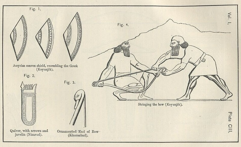 Assyrian bows were of two kinds, curved and angular. Compared with the Egyptian, and with the bows used by the archers of the middle ages, they were short, the greatest length of the strung bow being about four feet. They seem to have been made of a single piece of wood, which in the angular bow was nearly of the same thickness throughout, but in the curved one tapered gradually towards the two extremities. At either end was a small knob or button, in the later times often carved into the representation of a duck's head. [PLATE CIII, Fig. 3.] Close above this was a notch or groove, whereby the string was held in place. The mode of stringing was one still frequently practised in the East. The bowman stooped, and placing his right knee against the middle of the bow on its inner side, pressed it downwards, at the same time drawing the two ends of the bow upwards with his two hands. [PLATE CIII, Fig. 4.] A comrade stood by, and, when the ends were brought sufficiently near, slipped the string over the knob into the groove, where it necessarily remained. The bend of the bow, thus strung, was slight. When full drawn, however, it took the shape of a half-moon, which shows that it must have possessed great elasticity. [PLATE CIV., Fig. 4.] The bow was known to be full drawn when the head of the arrow touched the archer's left hand.