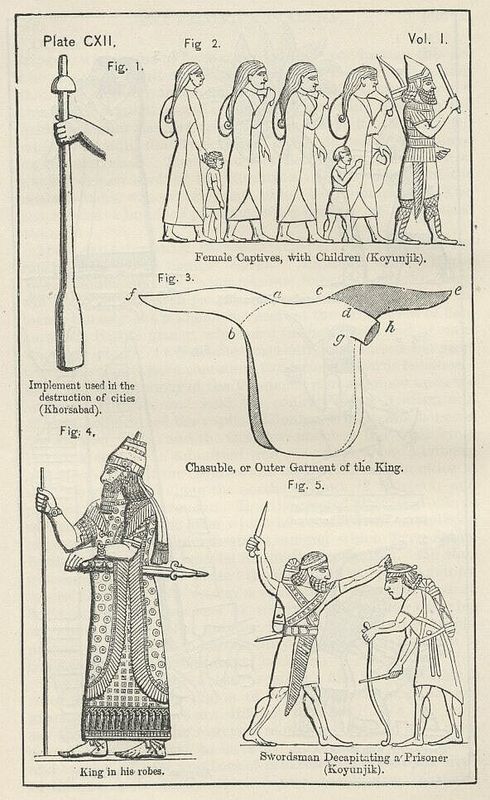 The women and children carried off by the conquerors were treated with more tenderness than the men. [PLATE CXII., Fig. 2.] Sometimes on foot, but often mounted on mules, or seated in carts drawn by bullocks or asses, they followed in the train of their new masters, not always perhaps unwilling to exchange the monotony of domestic life at home for the excitement of a new and unknown condition in a fresh country. We seldom see them exhibiting any signs of grief. The women and children are together, and the mothers lavish on their little ones the usual caresses and kind offices, taking them in their laps, giving then the breast, carrying them upon their shoulders, or else leading them by the hand. At intervals they were allowed to stop and rest; and it was not even the practice to deprive them of such portion of their household stuff as they might have contrived to secure before quitting their homes. This they commonly bore in a bag or sack, which was either held in the hand or thrown over one shoulder, When they reached Assyria, it would seem that they were commonly assigned as wives to the soldiers of the Assyrian army.