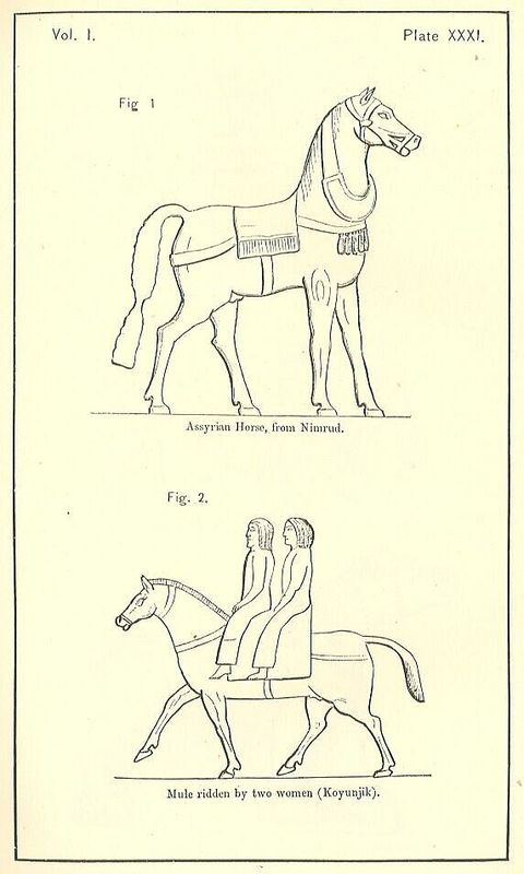 Chariot-horses were trained to three paces, a walk, a trot, and a gallop. In battle-pieces they are commonly represented at full speed, in marches trotting, in processions walking in a stately manner. Their manes were frequently hogged, though more commonly they lay on the neck, falling (apparently) upon either side indifferently. Occasionally a portion only was hogged, while the greater part remained in its natural condition. The tail was uncut, and generally almost swept the ground, but was confined by a string or ribbon tied tightly around it about midway. Sometimes, more especially in the later sculptures, the lower half of the tail is plaited and tied up into a loop or bunch [PLATE XCIV., Fig. 5], according to the fashion which prevails in the present day through most parts of Turkey and Persia.